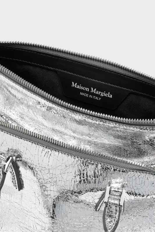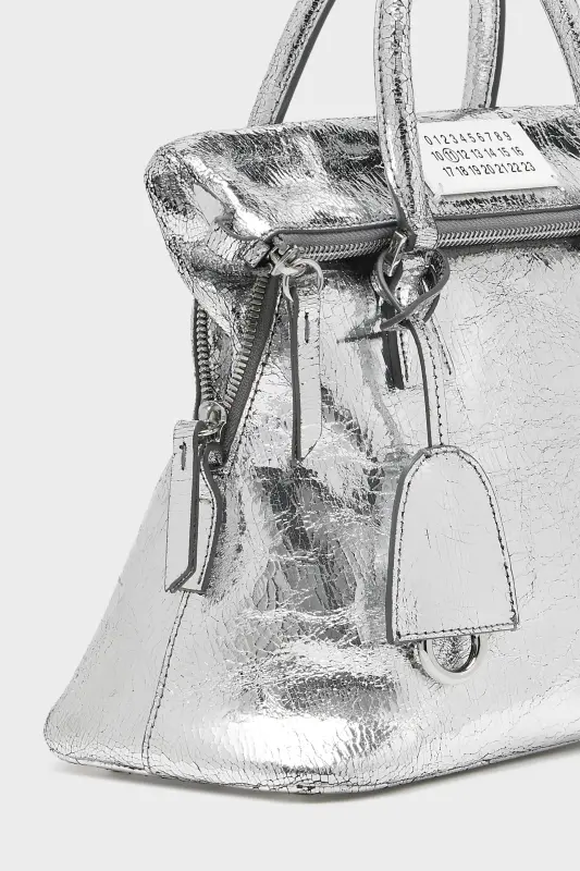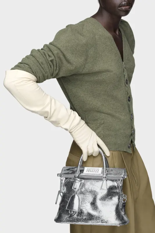 The 5AC classique mini is presented in crackled metallic leather with structured top handles and a tonal shoulder strap. Exposed hand-painted edges and leather-covered rivets reflect the Maison’s artisanal process. At the front, the numeric logo label highlights its archival roots. The iconic 5AC line takes its name from the French word 'sac' (bag). It explores the Maison's Anonymity of the lining concept, revealing the bag’s inner structure.