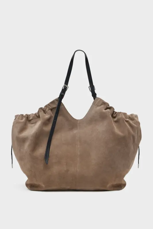Crafted in supple suede, this oversized shopper merges volume with structure. The gathered top softens its angular form, while belt-inspired leather handles lend a utilitarian edge. A detachable pouch tucks inside, designed for everyday essentials. At the front, the Maison’s signature four stitches appear; the opposite of a label.