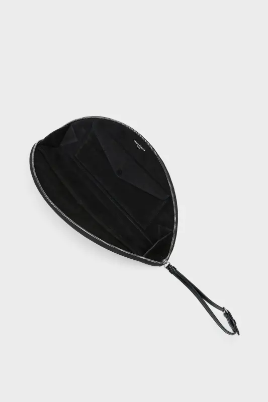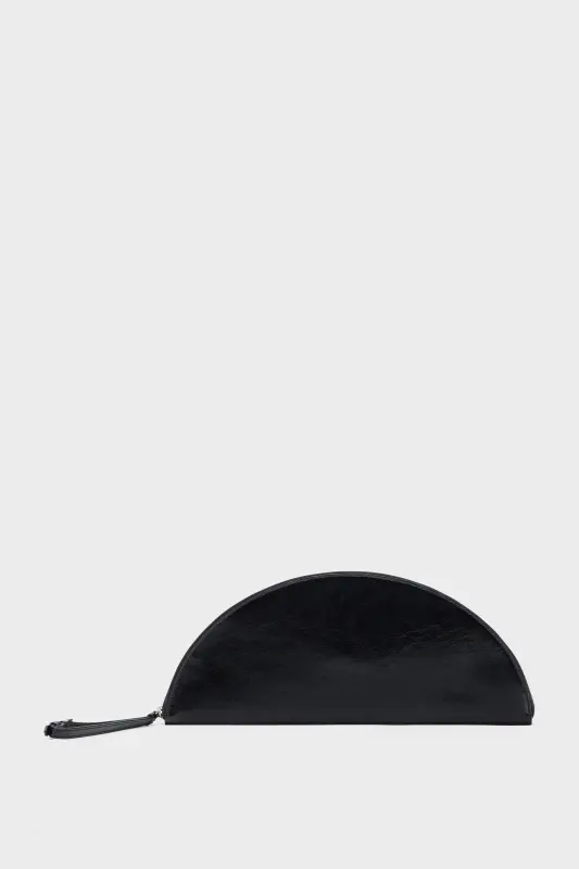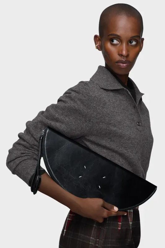 A half-moon pouch in a wrinkled glossy leather. The mini bag features a metallic zipped main compartment, adjustable wrist strap and is finished with the Maison’s signature, the four stitches; the opposite of a label.