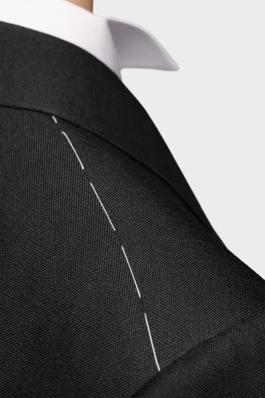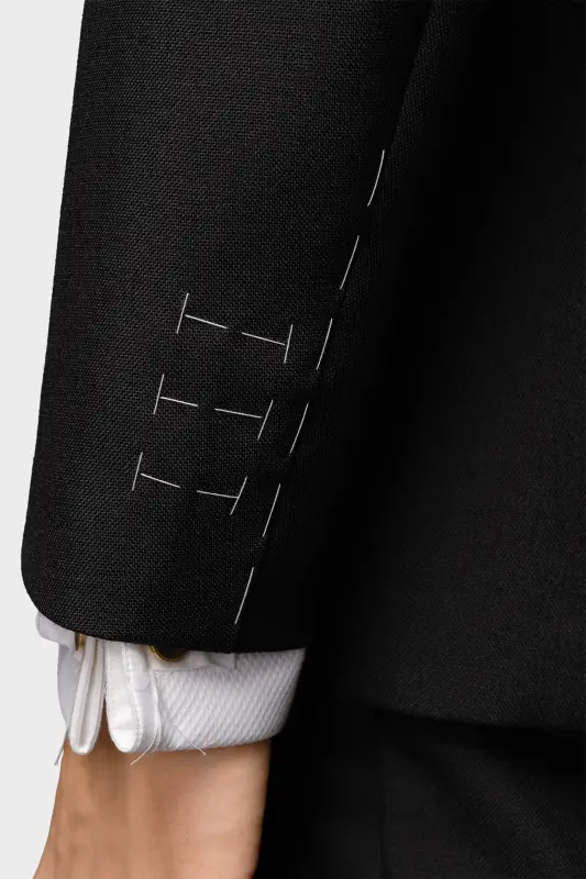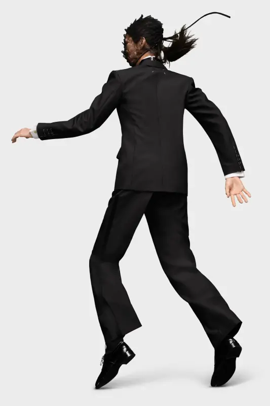 With work-in-progress details at the cuffs, the jacket is double-breasted with a notched collar. It features two envelope pockets and a back vent. Maison Margiela's signature, the four stitches, appear at the back; the opposite of a label.