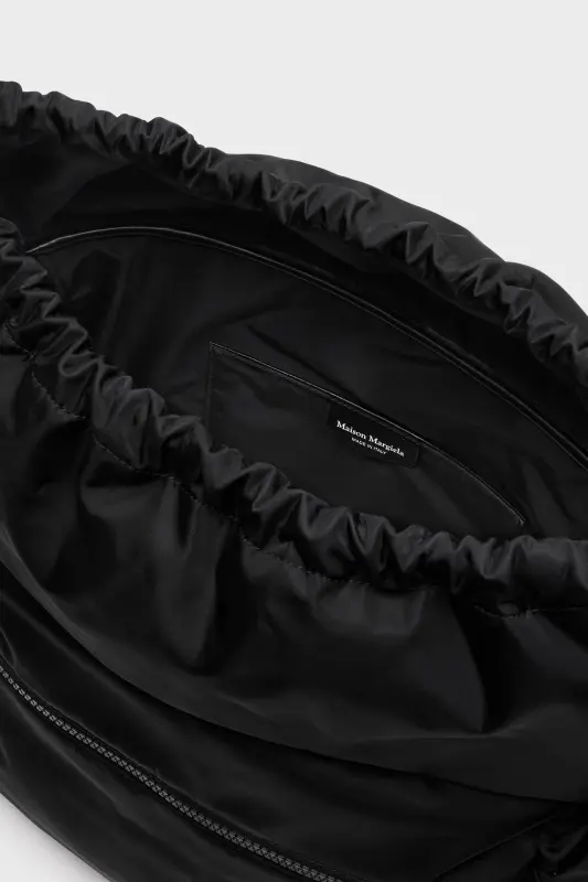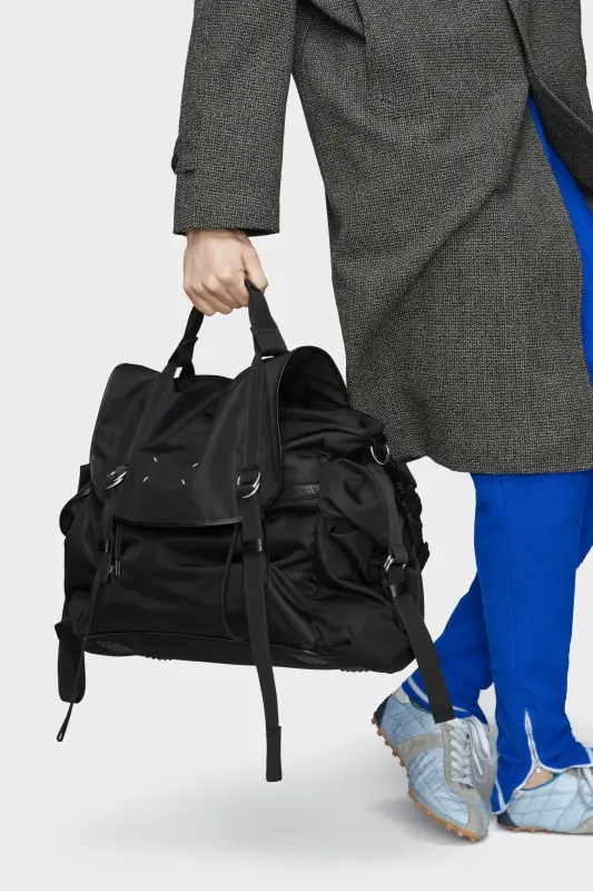 Maison Margiela reimagines the messenger bag with a sculpted form, buckle-fastened flap top and dual side compartments. Its rigid structure contrasts with breathable mesh and soft straps, designed for ease of wear. A tonal logo plaque sits at the back, while the four stitches appear at the front – the opposite of a label.