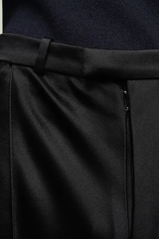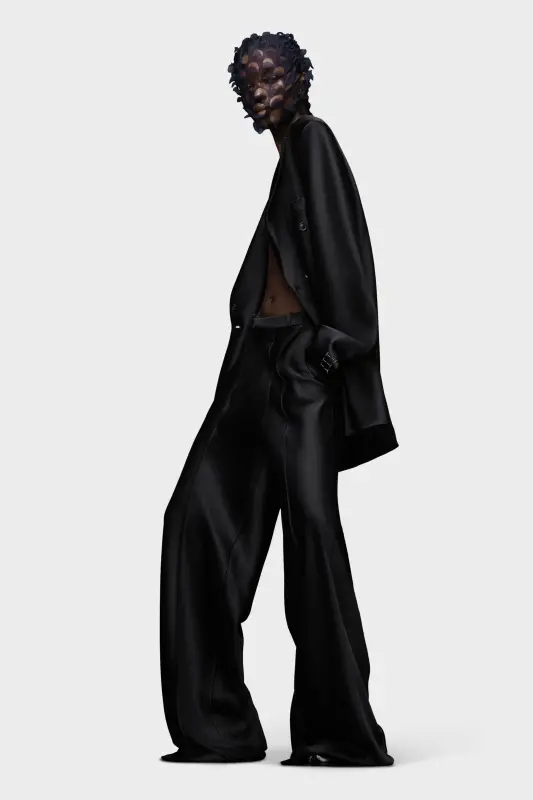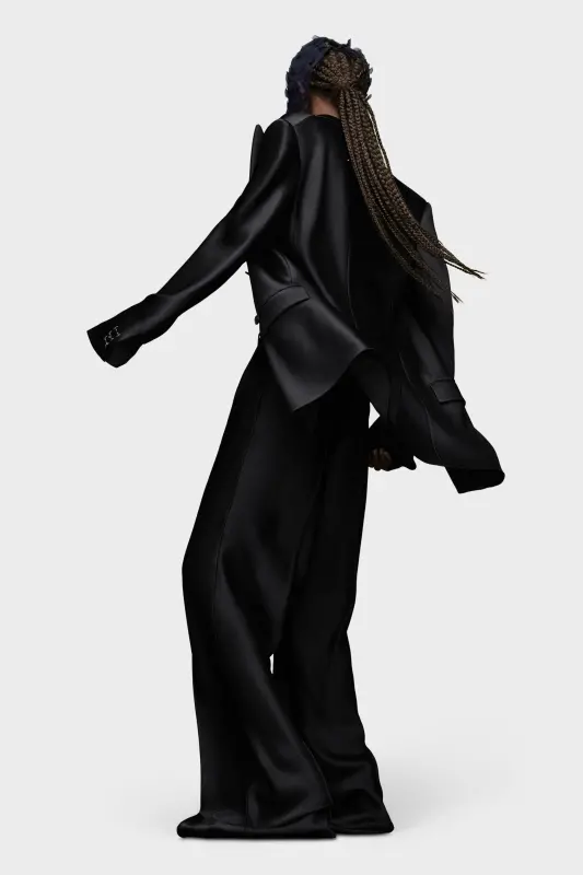 Crafted from satin, this two-piece suit has a double-breasted blazer with notched collar and oversized trousers. The cuff show the Maison's memory of concept and an asymmetric M button is featured. At the back, the four white stitches show the hand of the Maison: the opposite of a label.