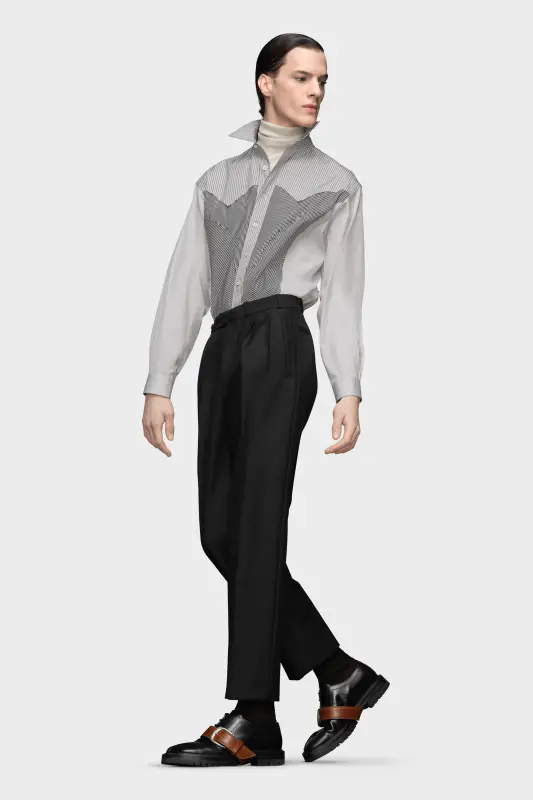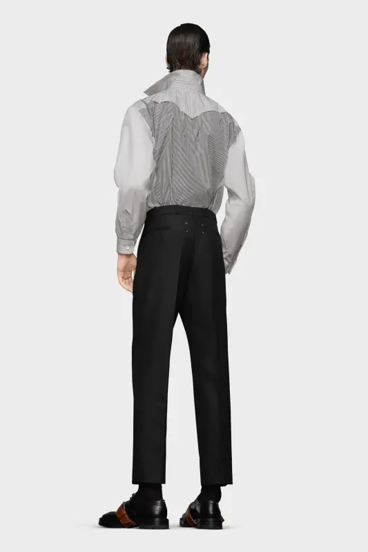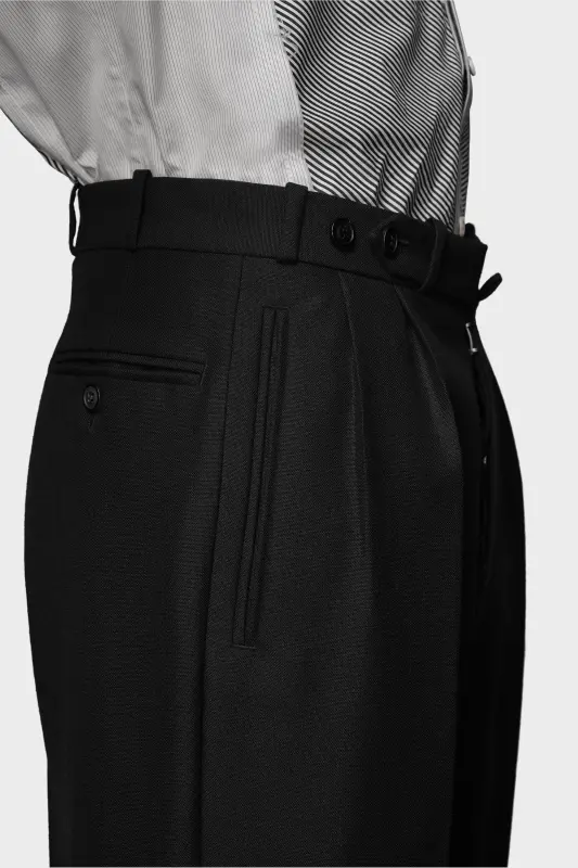 In British mohair, the suit trousers feature pleats and the Margiela hook closure. At the waist, they are designed with belt loops, a decorative tab and side buttons for an adjustable fit. Maison Margiela's signature, the Four stitches, appear at the back; the opposite of a label.