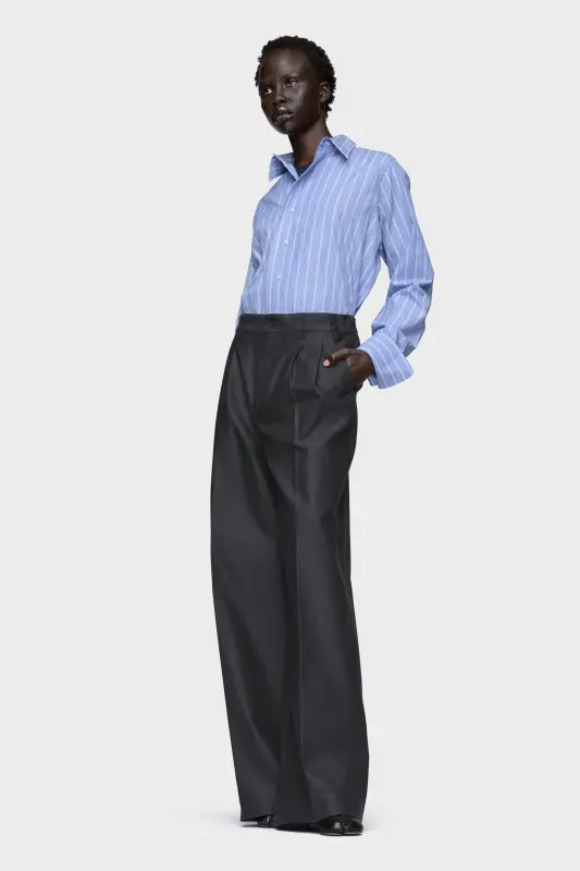 A sharp reinterpretation of the classic shirt, cut in cotton with extended cuffs and an elongated hem that curves to a centre point. Tailored with precision and subtle disruption, it captures the Maison’s refined take on structure and imbalance. At the back, the Maison’s signature four stitches appear; the opposite of a label.