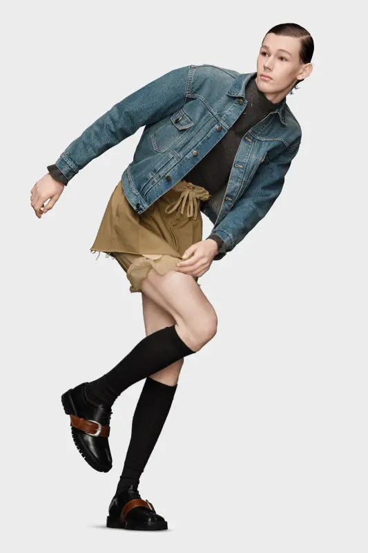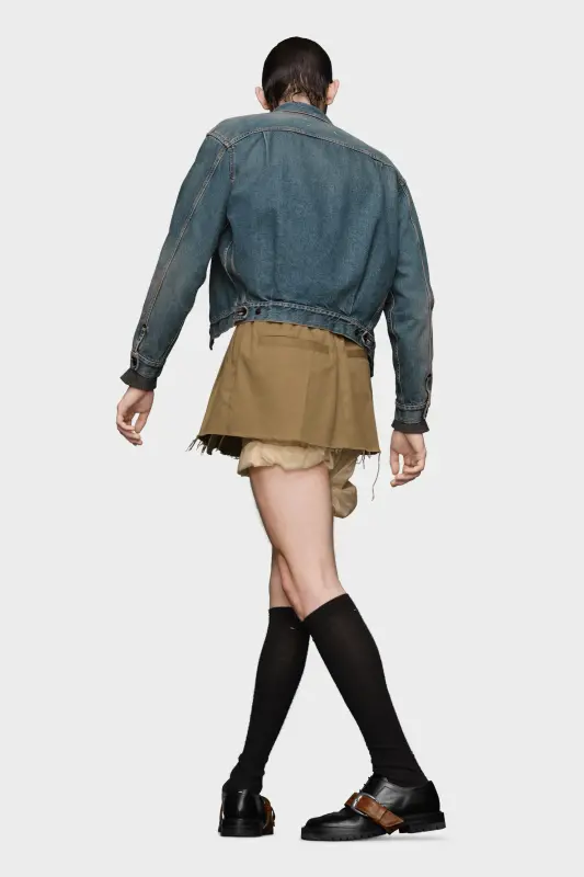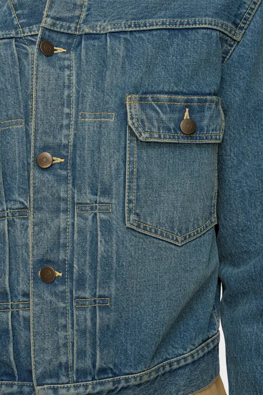 The fitted denim jacket features buttoned chest pockets and exposed stitching with pleat detail to the sides of the buttoned placket. Maison Margiela's signature, the Four stitches, appear at the back; the opposite of a label.