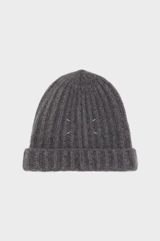 The beanie hat features a ribbed finish with a turn-up design. It is soft-touch, crafted from luxurious felted lambswool, and inspired by British school uniforms. Maison Margiela's signature, the four stitches, appear at the back; the opposite of a label.