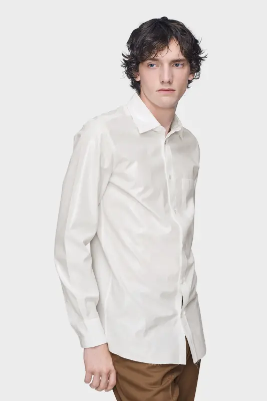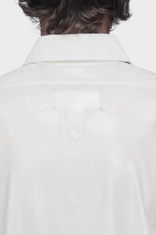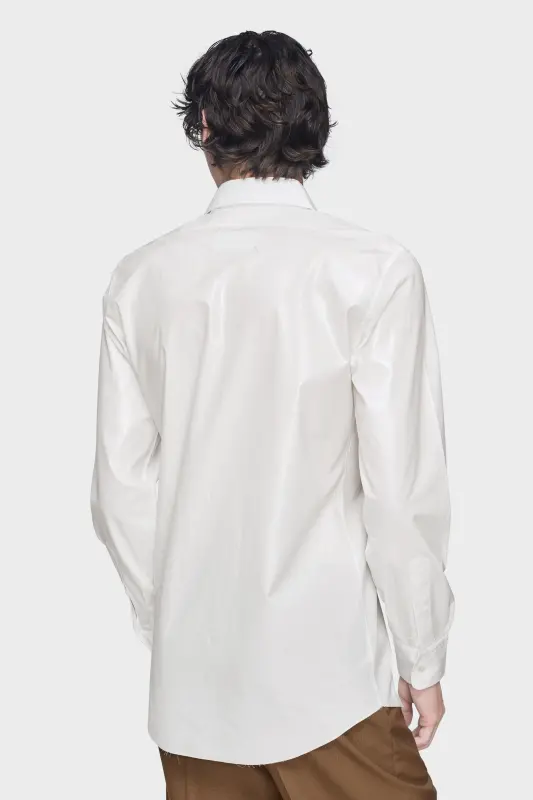 Maison Margiela reinterprets the poplin shirt through its pressed and foiled technique, a coated treatment that lends a sleek, lustrous finish. The design balances tradition and experimentation: sharp collar, button closure and chest pocket meet a fabric that catches the light. At the back, the Maison’s signature four stitches appear; the opposite of a label.