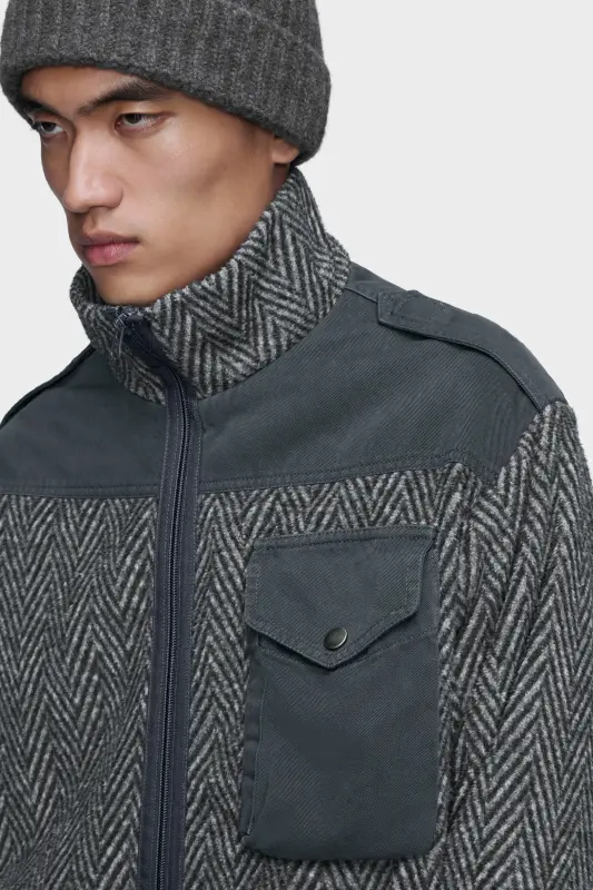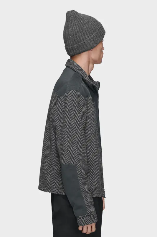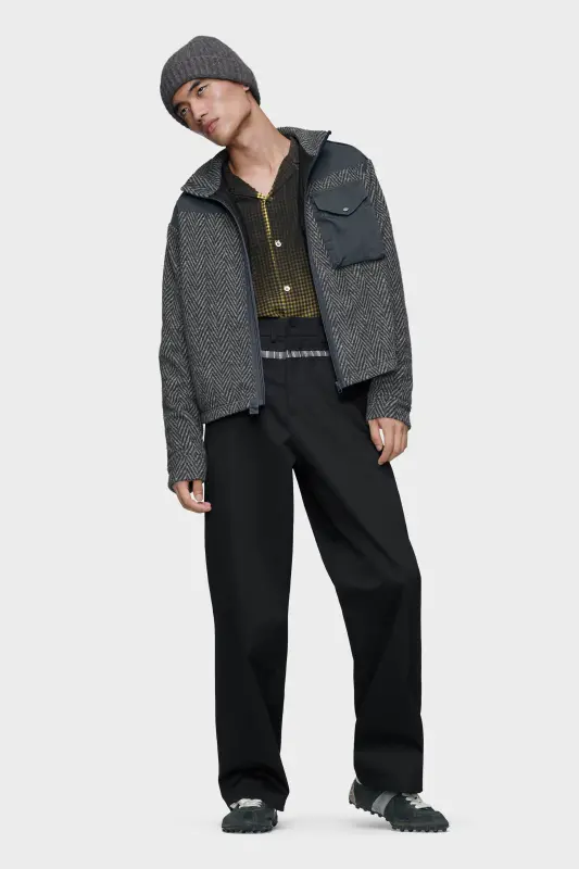 A caban defined by its jacquard fleece construction. The woven houndstooth brings depth and softness, offset by contrast fabric on the pocket and shoulders. With a zip closure and high collar, the piece blurs boundaries between tailoring, utility and sportswear. At the back, the Maison’s signature four stitches appear; the opposite of a label.