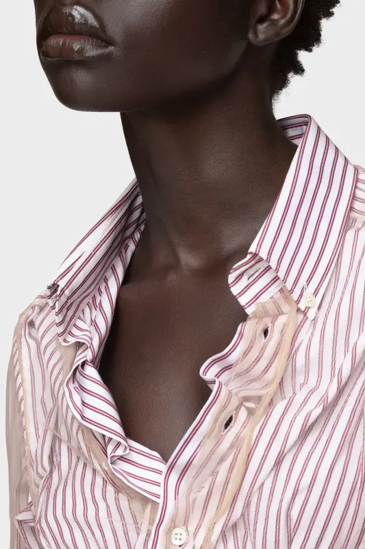 A striped cotton shirt overlaid entirely with fitted sheer tulle. Gathered sleeves and a shaped hem introduce movement, drawing from the Maison’s Gestural Cutting technique. At the back, the Maison’s signature four stitches appear; the opposite of a label.