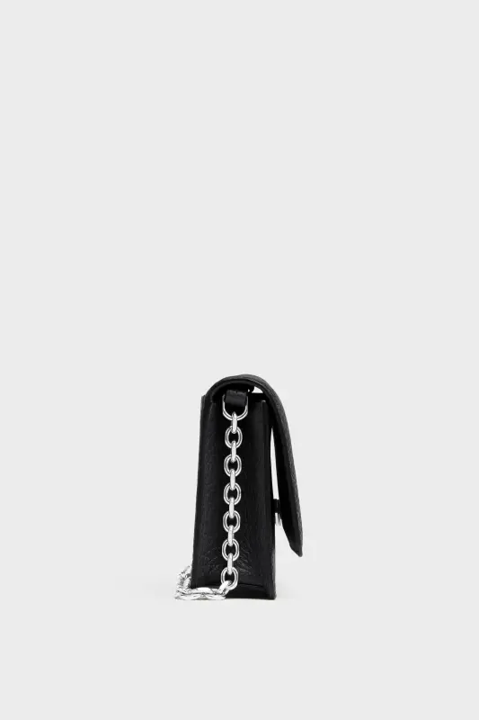 In embossed grainy leather with a chain, the wallet has a snap button closure and zipped inner section. It features the numeric logo inside. Maison Margiela's signature, the four stitches, appear on the flap; the opposite of a label.