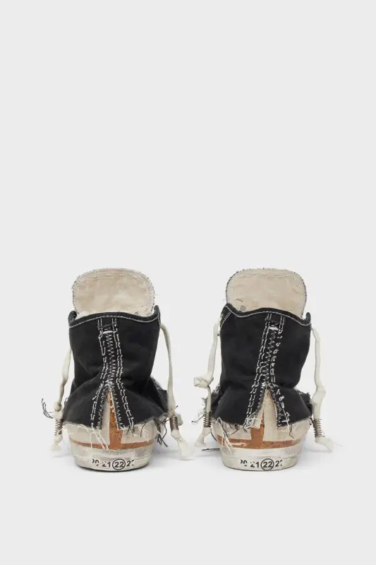 These Love to Death sneakers are crafted in layered canvas, detailed with raw edges, distressed soles, and visible seams. Treated for a worn effect, the design reworks a classic high-top silhouette with a sense of built-in history.