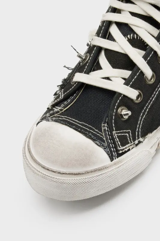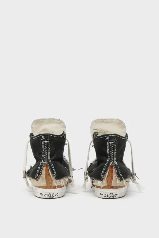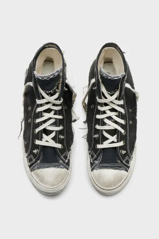A symbol of impermanence and identity, these Love to Death sneakers are crafted in layered canvas, sliced and frayed to reveal traces of wear. The design distorts classic construction with exposed stitching, distressed edges, and a handmade effect across every panel. A tactile manifestation of memory in motion.