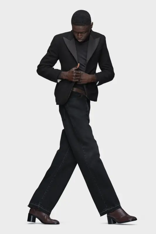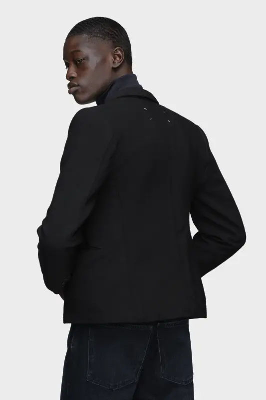 This minimal wool blazer is cut with a peak lapel, single-breasted closure and three external pockets. It features considered proportions, crafted using the Maison’s Shrink to Fit technique, the fabric is boiled to subtly reshape its form. Maison Margiela’s signature, the four stitches, appear at the back; the opposite of a label.