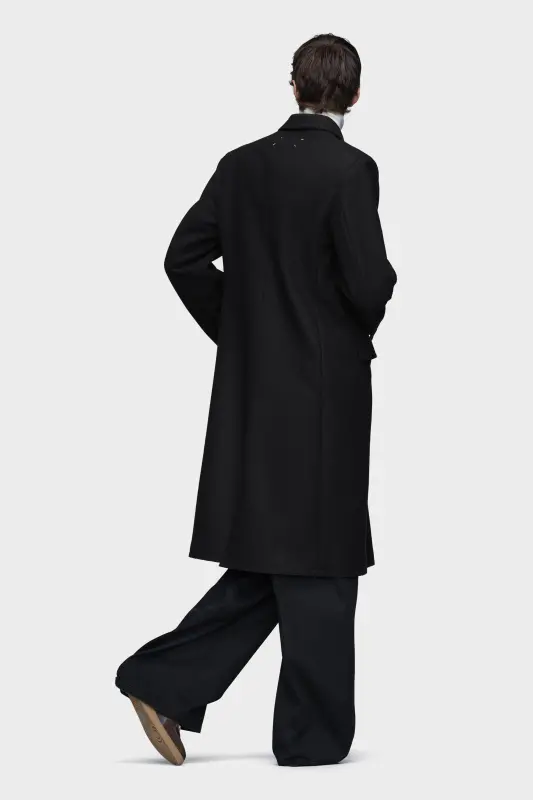 This double-breasted coat is crafted from felted wool, featuring a wide notched lapel and a silhouette shaped with structured shoulders and a lightly cinched waist, evoking the fitted elegance of a riding coat. Referencing the collection’s equestrian narrative, it embodies a refined, timeless design. Maison Margiela’s signature, the four stitches, appear at the back; the opposite of a label.