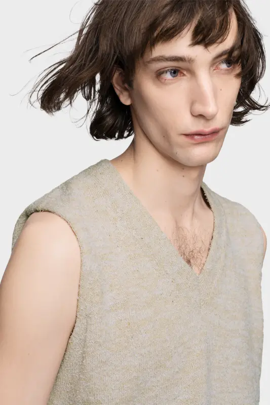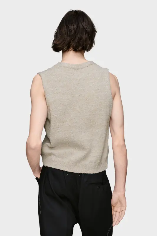 Knitted in a light bouclé weave with a deep V-neck, this vest features a pared-back construction and sleeveless form. Its minimal silhouette evokes the quiet discipline of the collection, reinterpreting traditional wardrobe foundations. Maison Margiela’s signature, the four stitches, appear at the back; the opposite of a label.