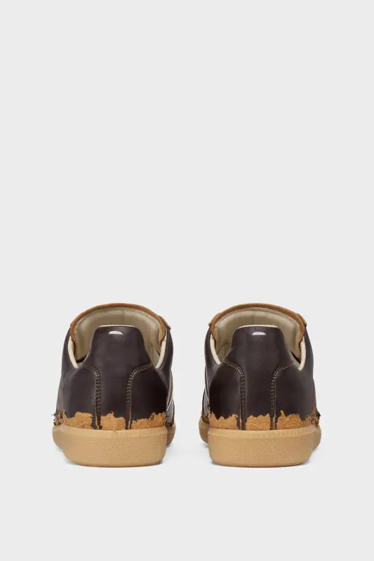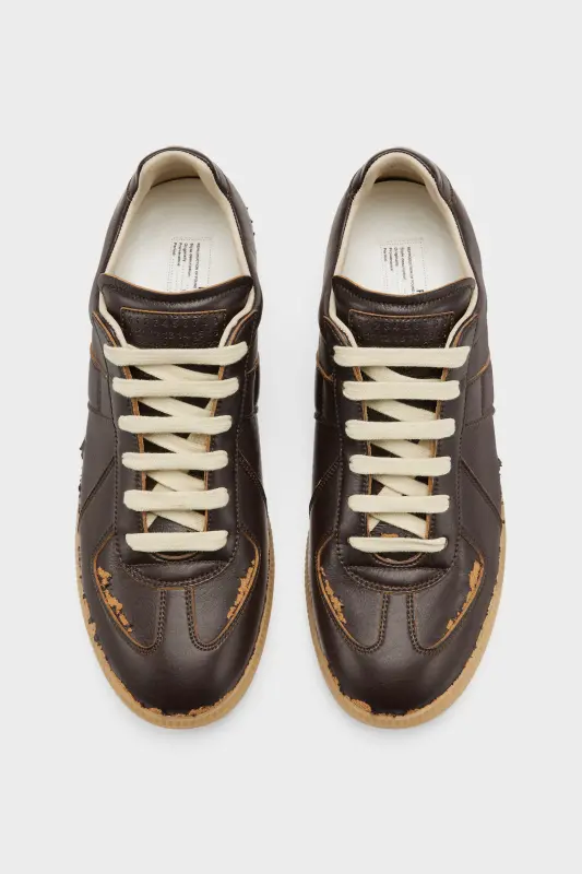 This Replica sneaker is designed in leather with a dynamic peel-off effect, offering a distinct, worn-in aesthetic that evokes a sense of history and individuality. The Maison’s iconic Replica sneakers are inspired by Austrian sports shoes from the seventies. Details on the Replica pairs are continually reworked in line with the season’s inspirations. Maison Margiela's signature white stitch appears at the back.