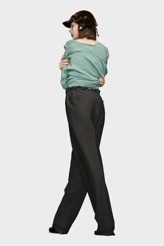 The trousers are crafted from mohair wool. They feature pleats down the front and back – a smart contrast to the tied drawstring waist. Contrast work-in-progress stitches circle the waistband for a style disruption indicating the garment is never finished. Maison Margiela's signature, the four stitches, appear at the back; the opposite of a label.