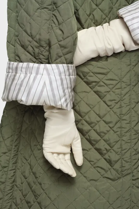 A longline quilted coat with a relaxed silhouette and a sculpted stand collar that can be worn up or down. The contrast pinstripe lining is subtly revealed at the rolled-up sleeves. Finished with a button closure, flap pockets and a single welt chest pocket, the design merges utility with understated elegance. The quilting technique subtly elevates texture and structure, layering fine materials to create a delicate, three-dimensional effect. The back features the Maison’s signature, the four stitches; the opposite of a label.