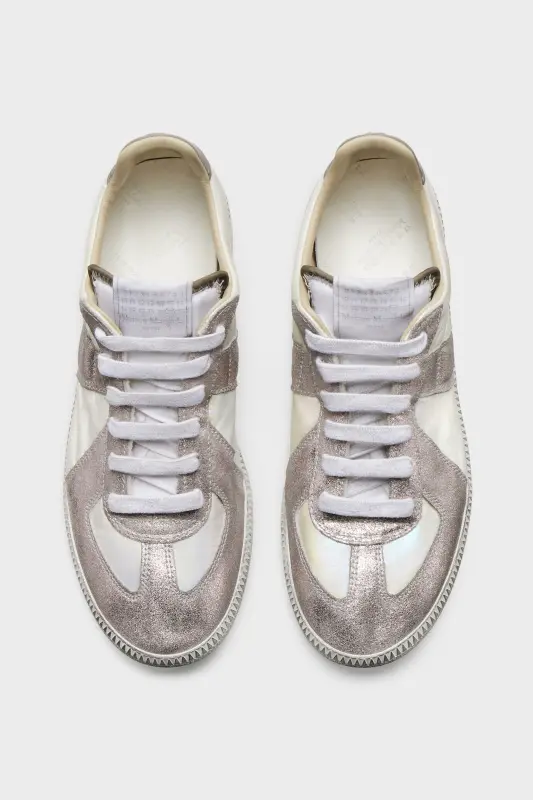 The Replica Iridescent sneakers are crafted in smooth calfskin and a glitter suede with a high-shine finish and iridescent coating that reflects coloured tones in the light. The Maison's iconic Replica sneakers are inspired by Austrian sports shoes from the seventies. Details on the Replica pairs are continually reworked in line with the season's inspirations.