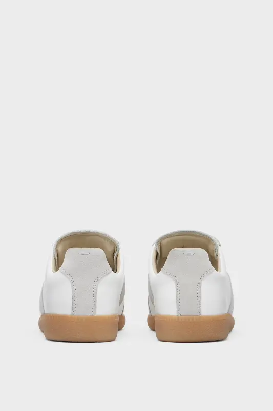 The Replica sneakers in nappa leather and suede with a honey sole. The Maison's iconic Replica sneakers are inspired by Austrian sports shoes from the seventies. Details on the Replica pairs are continually reworked in line with the season's inspirations.