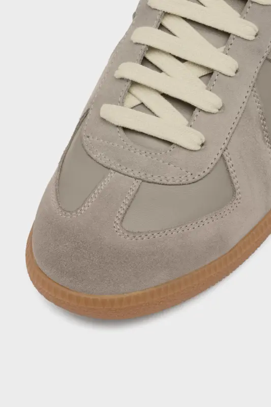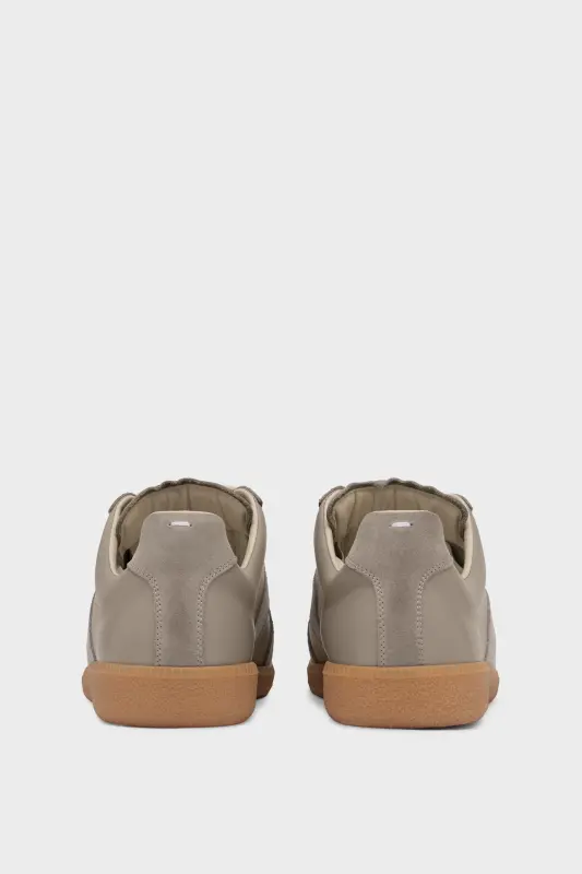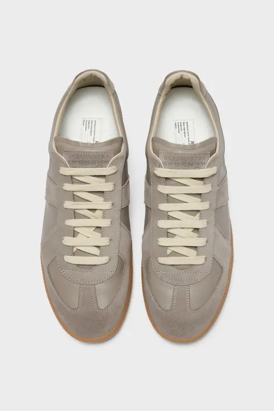The Replica sneakers in nappa leather and suede with a honey sole. The Maison's iconic Replica sneakers are inspired by Austrian sports shoes from the seventies. Details on the Replica pairs are continually reworked in line with the season's inspirations.