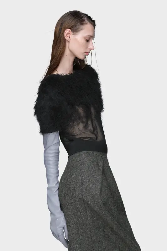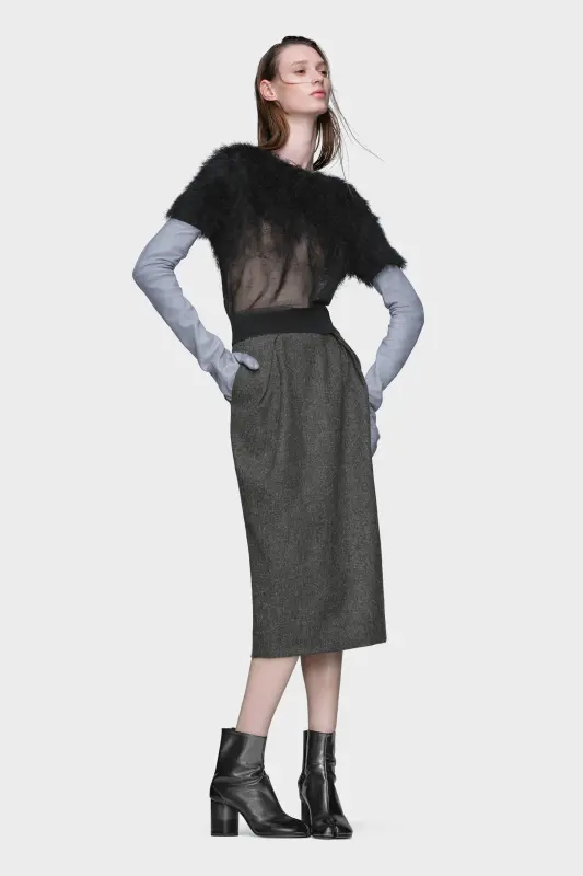 This short-sleeved top is crafted in silk knit with a textured finish that fades through the body – an expression of the Maison’s retrograding technique. The ribbed waistband and round neck create a neat contrast to the airy surface. At the back, the Maison’s signature four stitches appear; the opposite of a label.