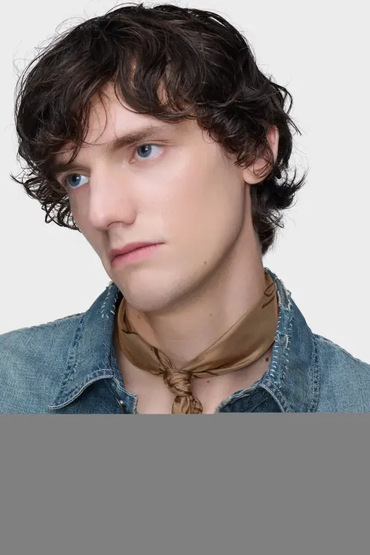 Maison Margiela translates its iconic numeric logo into an expressive foulard, rendered in silk with an oversized scribble effect. The sketch-like motif blurs permanence and impermanence, bringing a playful yet conceptual layer to a classic accessory.