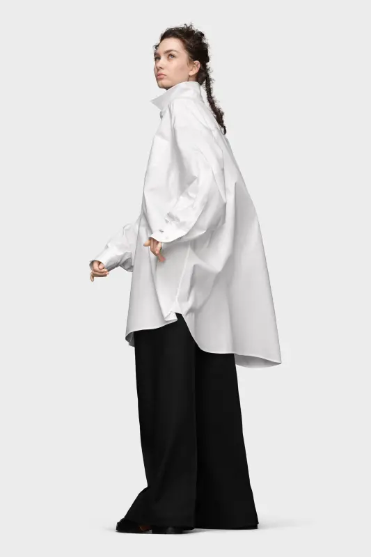 The long shirt is crafted from cotton poplin with a classic collar, patch pocket and curved hem. Maison Margiela's signature, the Four stitches, appear at the back; the opposite of a label.