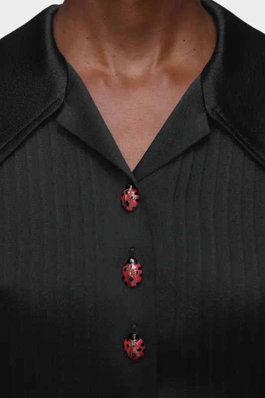 This silk-blend stole is crafted as a structured cropped top, featuring pleated detailing and contrasting panels. Ladybird-inspired buttons lend a playful note to its tailored silhouette, while slender ties at the side emphasise its deconstructed construction. At the back, the Maison’s signature four stitches appear; the opposite of a label.