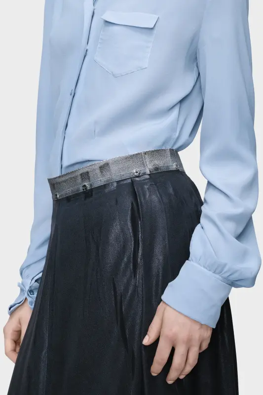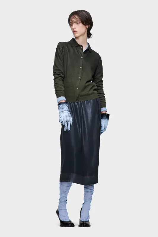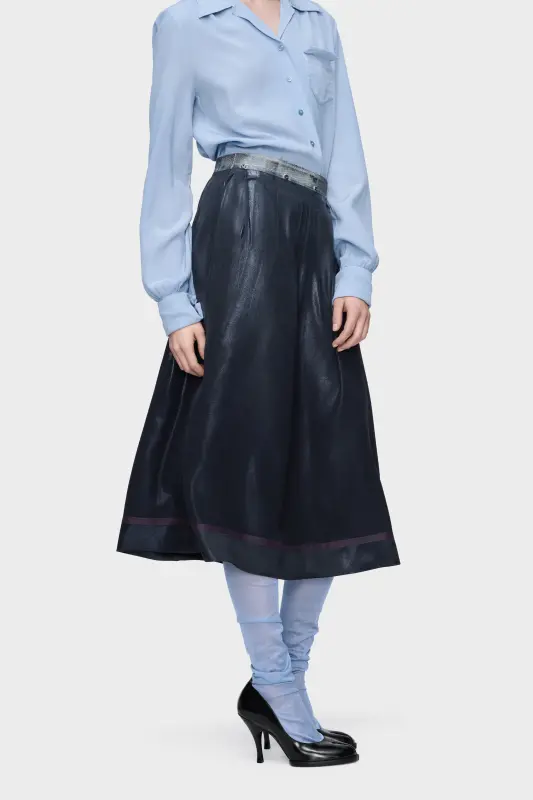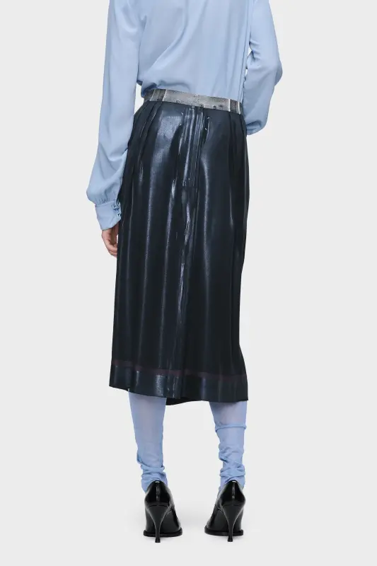 A foil-treated finish elevates this pleated midi skirt, achieved through the Maison’s pressed and foiled technique. Heat and pressure transform the fabric’s surface, shifting its depth into a lustrous, sculptural texture. At the back, the Maison’s signature four stitches appear; the opposite of a label.
