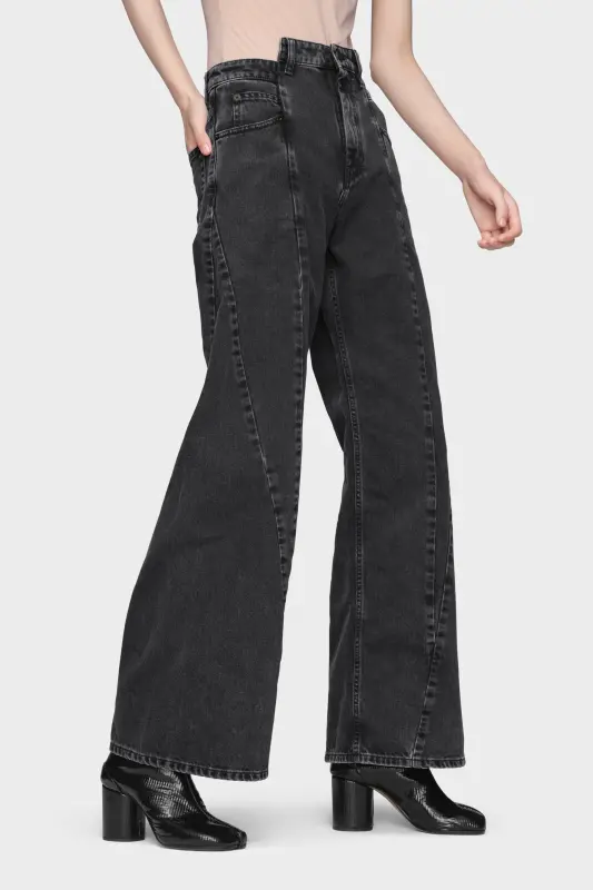 These spliced denim jeans challenge traditional denim with an unconventional, sculptural design. Geometric seams create dynamic tension and movement, while the high-waisted, wide-leg silhouette introduces a contemporary edge. The cut-out waist further elevates the deconstructed aesthetic, making these jeans a statement piece that fuses function with artistic expression.