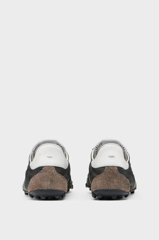The sprinters are refreshed with the season's foil treatment. The sneaker recalls 1960s spike shoes, crafted in Nylon and tonal suede panels, treated for a distressed effect. The cleated sole includes numeric detailing, with 22 circled to indicate the footwear collection. The tongue bears the numeric logo, while Maison Margiela's signature single white stitch appears at the back.