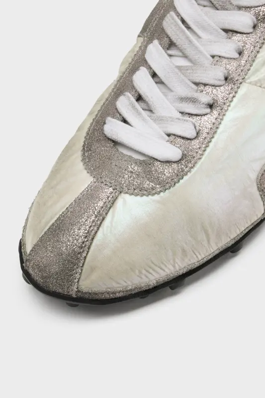 Maison Margiela revives 1960s spike shoes through high-shine lamé with glitter suede accents and tonal calfskin panels, treated for a distressed effect. The cleated sole includes numeric detailing, with 22 circled to indicate the footwear collection. The tongue bears the numeric logo, while Maison Margiela's signature single white stitch appears at the back.