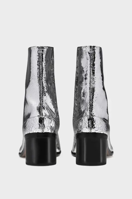 The Tabi boots in the broken mirror finish feature the Maison's iconic Tabi split-toe shape and contrast cylindrical heel. Tabi styles are inspired by the traditional 15th century Japanese sock bearing the same name. It captures the avant-garde and insubordinate spirit of the Maison and exists as a heritage classic, continually explored through each collection. 6cm heel.