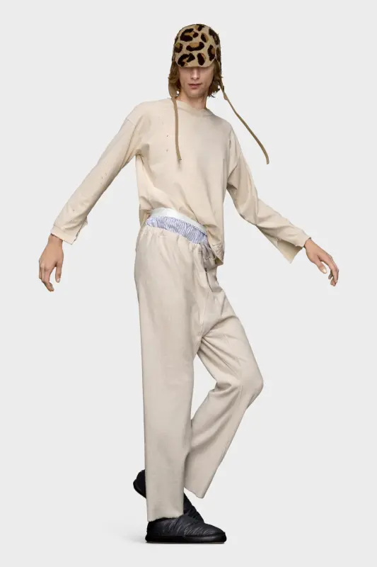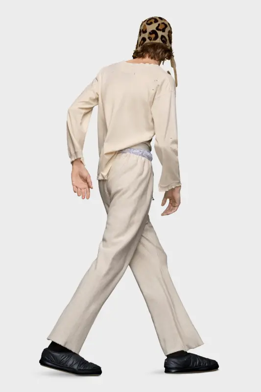 In cotton jersey, the round-neck, long-sleeve top features a handwritten Margiela logo at the hem. Raw edges present an undone aesthetic. Maison Margiela’s signature, the Four stitches, appear at the back; the opposite of a label.