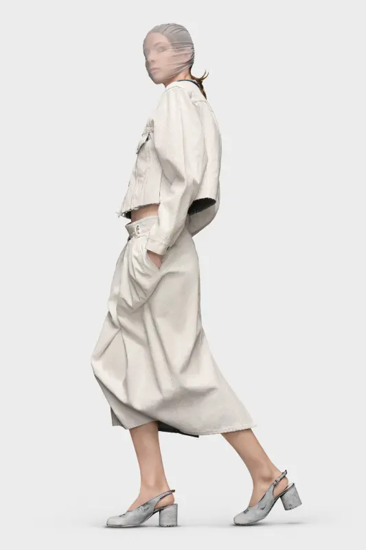 This fitted collarless denim jacket is cropped at the waist and has a cracked white effect. It features classic metal hardware and seam detailing. The contrast neck has a raw finish and the back shows the four white stitches, showing the hand of the Maison: the opposite of a label.