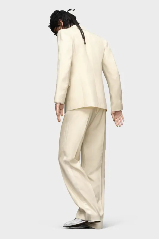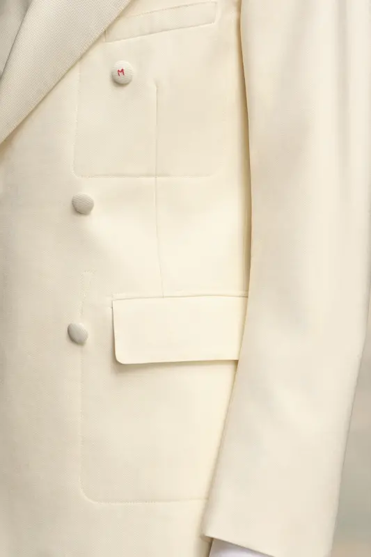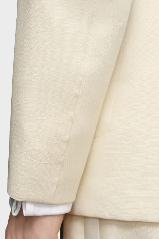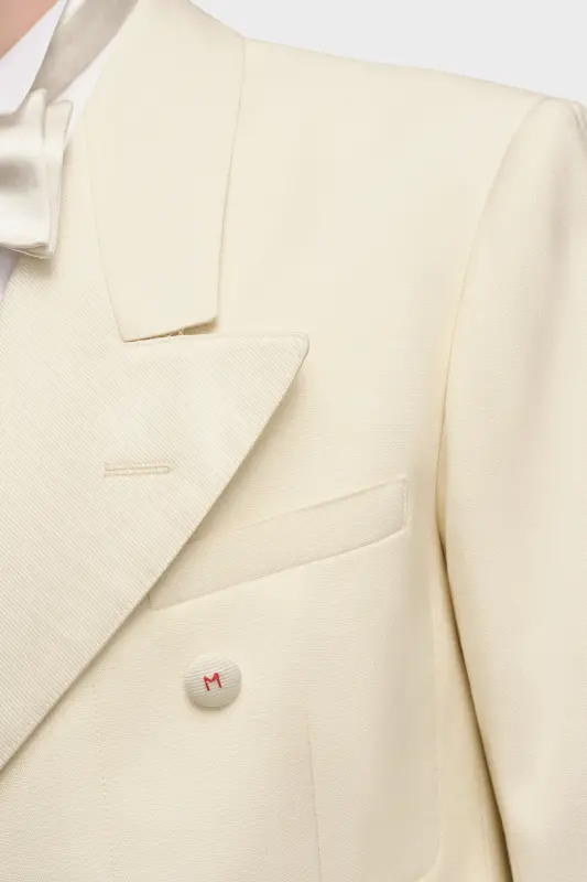 In mohair silk poplin, this double-breasted blazer has tonal buttons and as asymmetric M button. With a notched collar and flap pockets, it creates a classic silhouette.