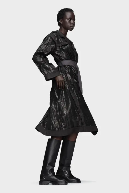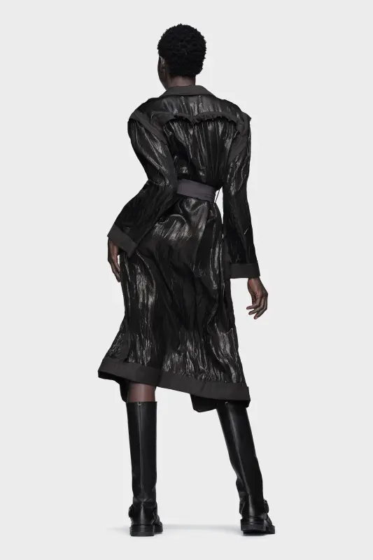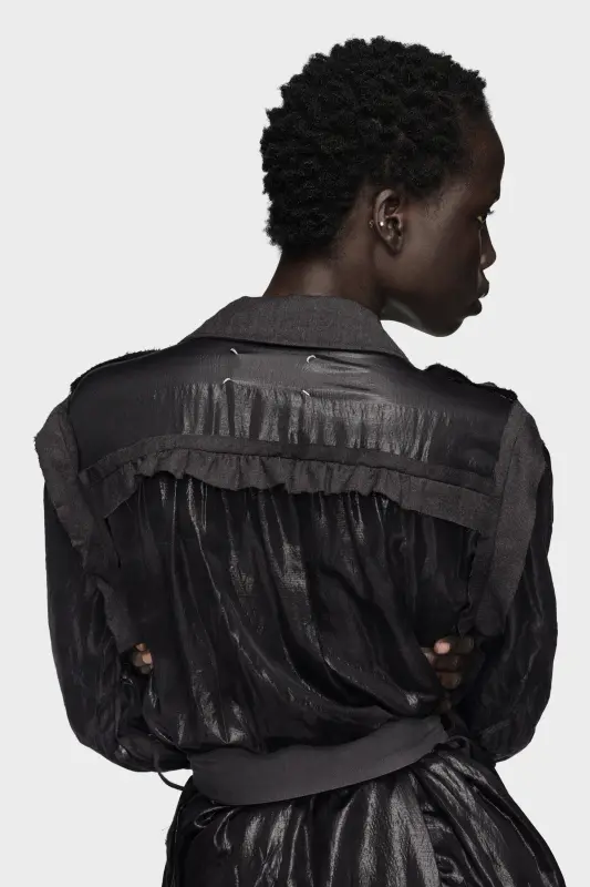 A reimagining of the trench coat in crinkled lamé, this piece offers a tactile interplay of matte and shine. Décortiqué shoulder details highlight hidden structures, while tonal trims and a structured belt frame the silhouette. The inside-out suggestion reveals a new form – a coat that becomes a dress. Maison Margiela’s signature, the four stitches, appear at the back; the opposite of a label.