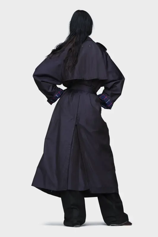 This long trench coat reflects Maison Margiela’s reworking of heritage archetypes. Traditional details – such as the waist belt and epaulettes – are retained but softened through a relaxed structure and minimal finish. The Memory of the Creases technique leaves behind subtle impressions of where folds once were, capturing the idea of a garment shaped by time. Maison Margiela’s signature, the four stitches, appear at the back; the opposite of a label.