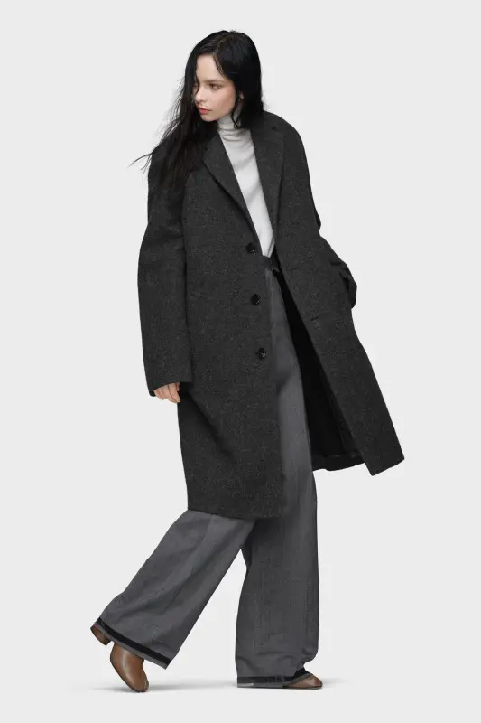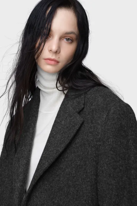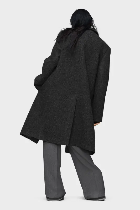 This wool coat is tailored with clean lines, notched lapels, and a three-button front. The structured silhouette is softened by drop shoulders, while a kick pleat adds ease of movement. Maison Margiela’s signature, the four stitches, appear at the back; the opposite of a label.