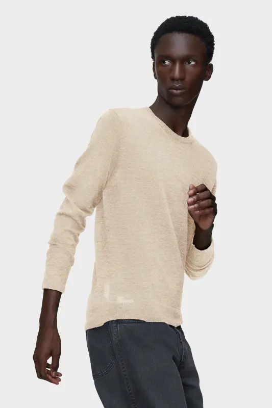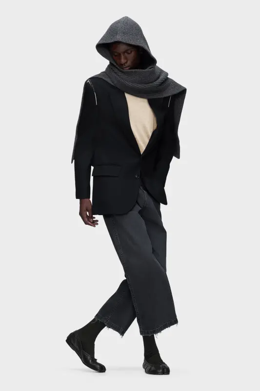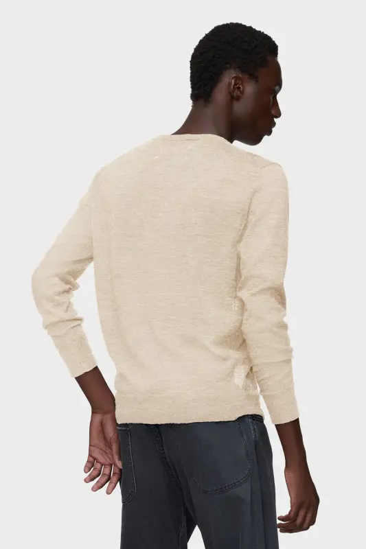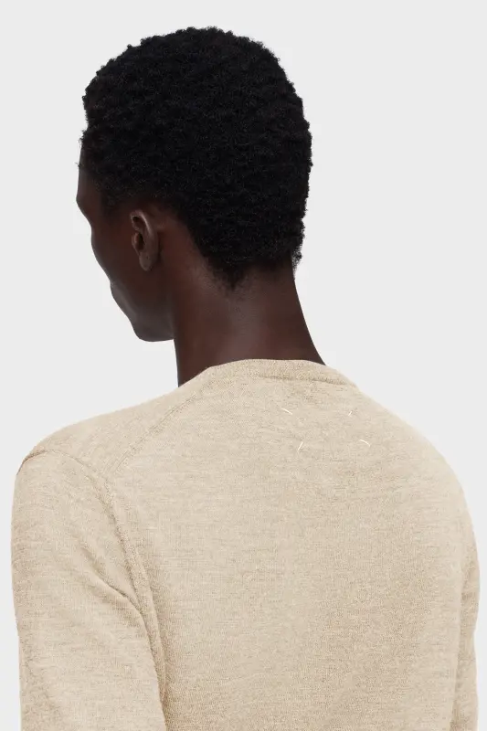 A fine wool blend sweater that reveals a subtle play of tones across its surface. The piece is finished with a single patch of visible mending at the hem, introducing a quietly subversive detail to its otherwise classic form. At the back, the Maison’s signature four stitches appear; the opposite of a label.