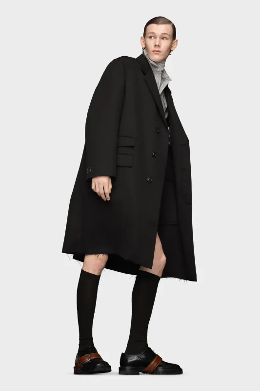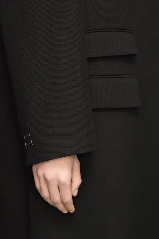 In a virgin wool silk blend with raw edges, the long coat features Work-in-progress stitching for a nonchalant approach to dressing. It comes complete with notched collar and asymmetric pocket placement. Maison Margiela's signature, the Four stitches, appear at the back; the opposite of a label.